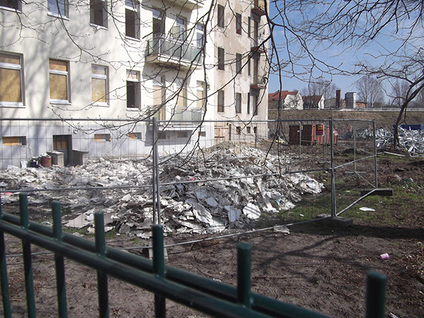 Nach unserer Beschwerde vom 12.06.2015, hat die Senatsverwaltung reagiert. Die restlichen Häuser werden mit einer Plane abgedeckt und dann erst abgerissen, damit wir Anwohner nicht wirder eine solche Staubentwicklung haben.